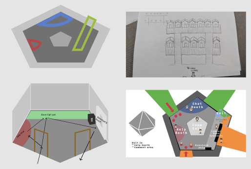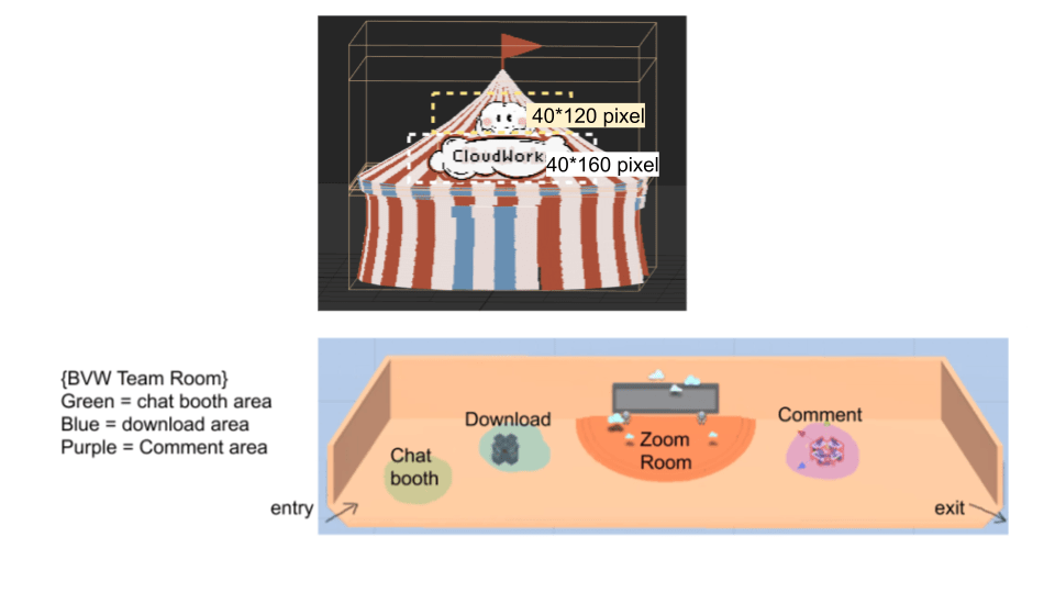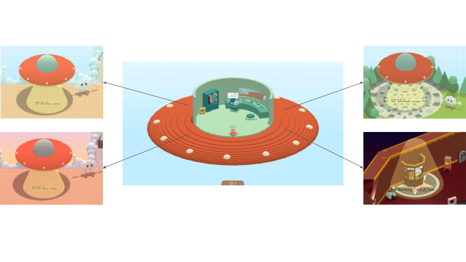 We designed customizable templates for every project team. It includes standardized entry and exit points, clickable holograms that guide guests to their designated Zoom rooms, and assistance with downloading the necessary game files. The streamlined submission process has resulted in a diverse range of content on the platform, as seen in the screenshots on the left.