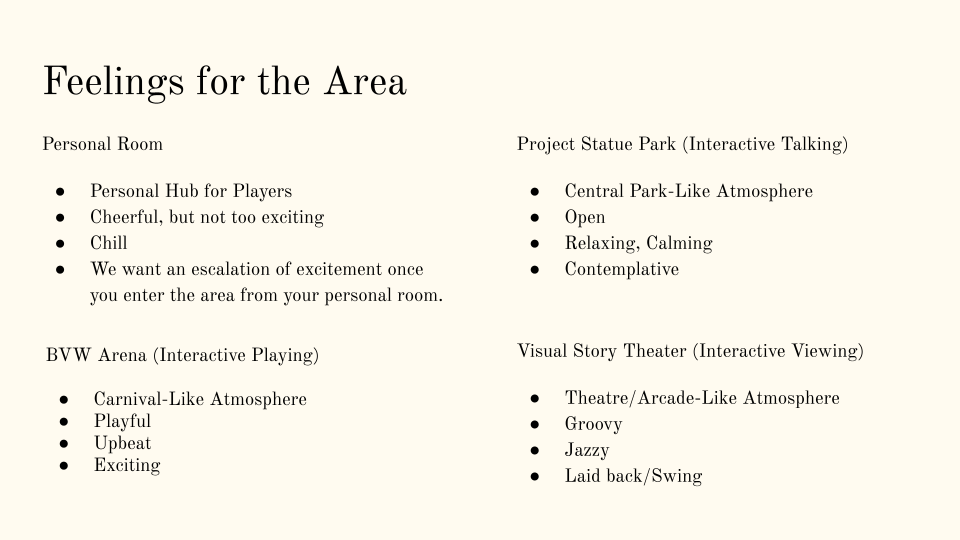 As the lead designer, I was responsible for establishing and communicating the distinct tone and guest flow for each of the four main areas. Working closely with various groups, I oversaw the design process and made necessary iterations based on the feedback from playtests.