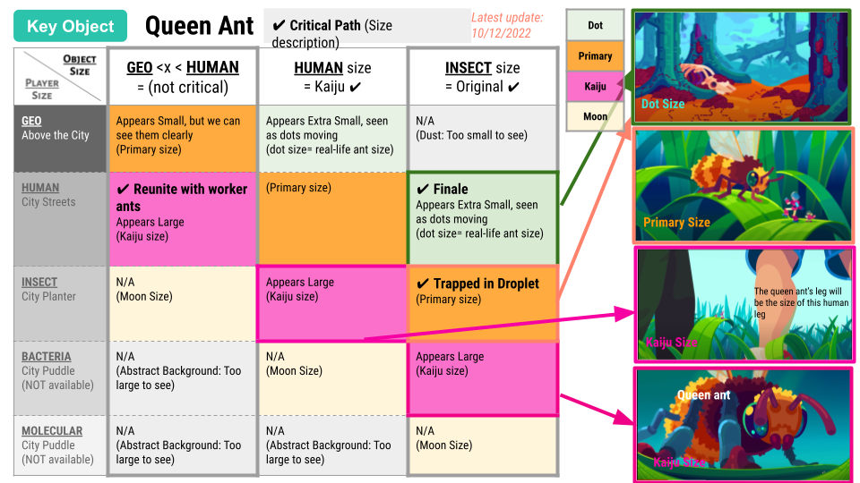 An example of a mission breakdown I created to determine the appropriate scale of an ant at each realm, for instance, when traveling down to the insect realm, a regular ant would appear as large as a car to the player.