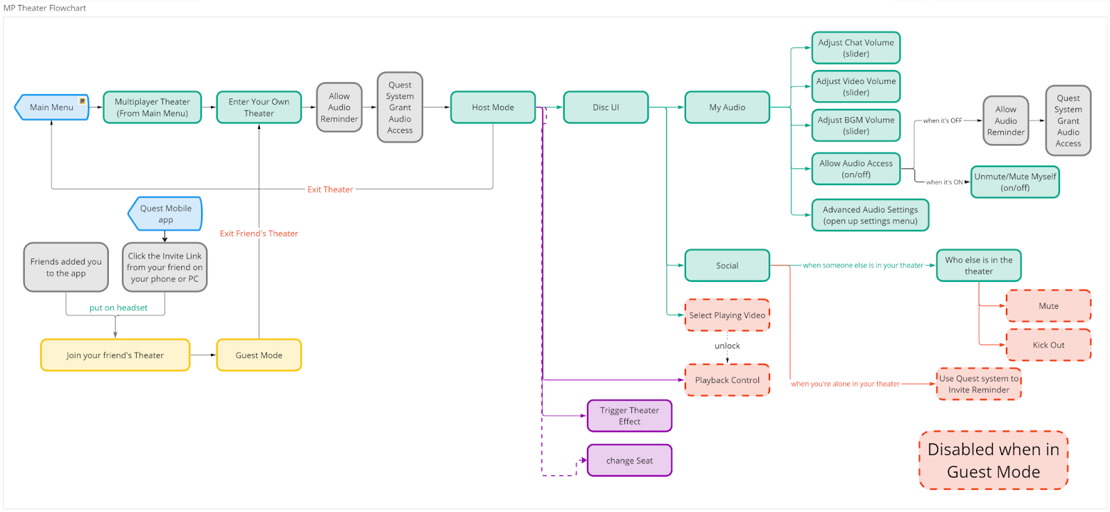 A feature map I created to communicate the networking system for multiplayer, outlining the distinct interfaces and features for both the host and guests.