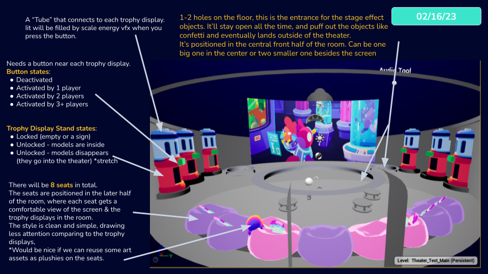 - Worked closely with the 3D artist to design a theater layout that supports up to eight players, ensuring clear sight lines to the screen, each other, and all interactive triggers.