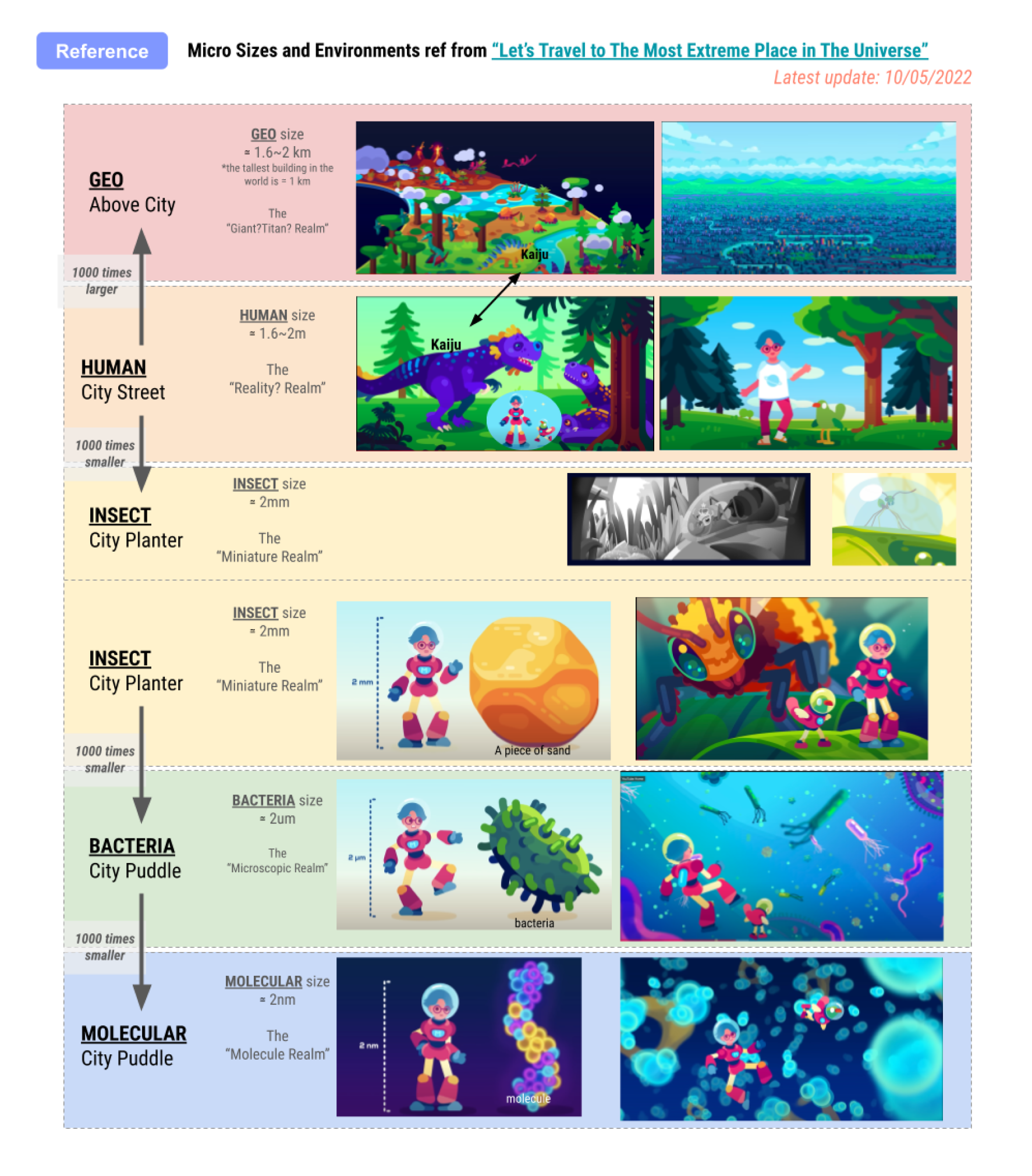 A one-sheet that explains how small the player becomes at each realm, starting from human scale and shrinking down through insect, bacteria, and finally to the molecular level.